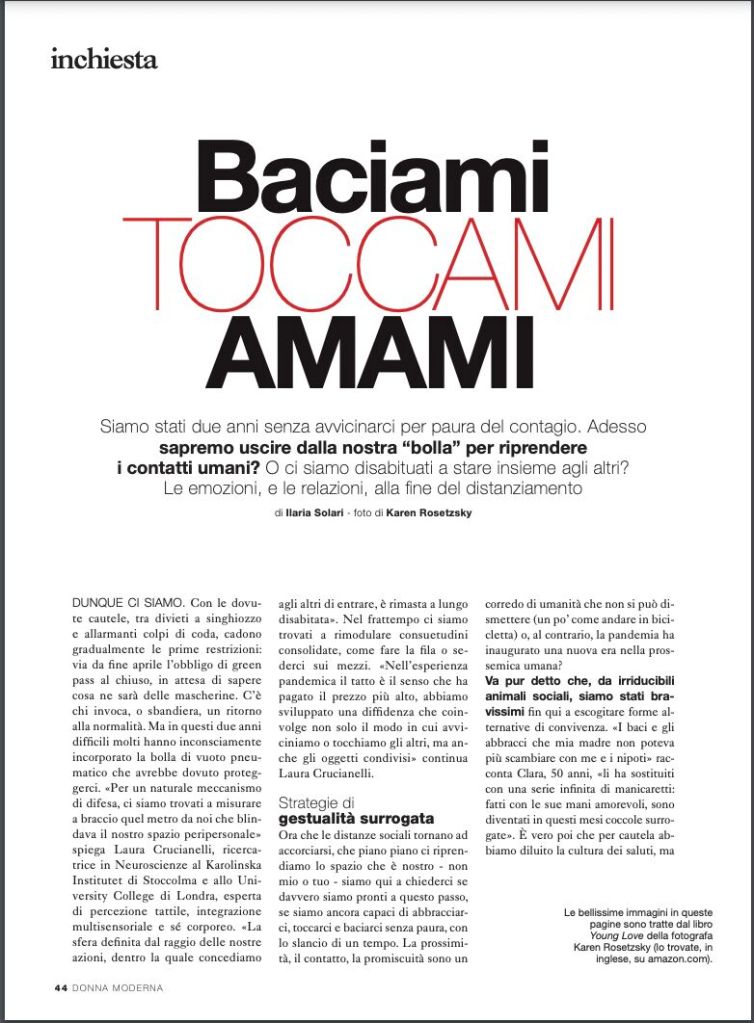Intervista in italiano sull’esperienza di contatto fisico e tattile che abbiamo visuto durante e dopo la pandemia. L’inchiesta completa di Ilaria Solari è su Donna Moderna.