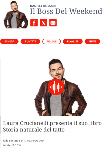 Il 17 novembre, ho presentato il mio libro “Storia Naturale del Tatto” durante un’intervista in diretta radiofonica con Daniele Bossari su Radio Deejay. Trovate la registrazione qui!